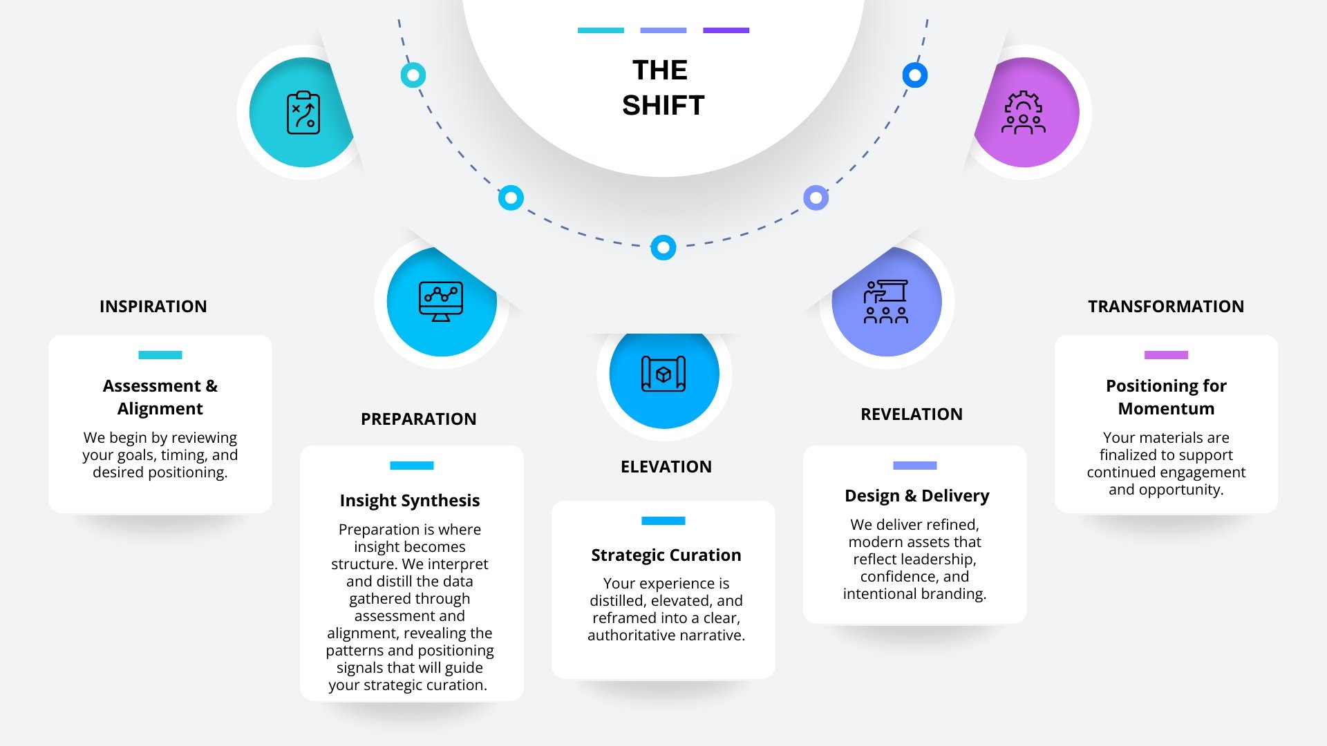 We begin by identifying the throughline of your leadership — the value you consistently deliver, the environments where you excel, and the influence you carry. From there, we curate every element of your brand presence to reflect alignment, authority, and readiness.